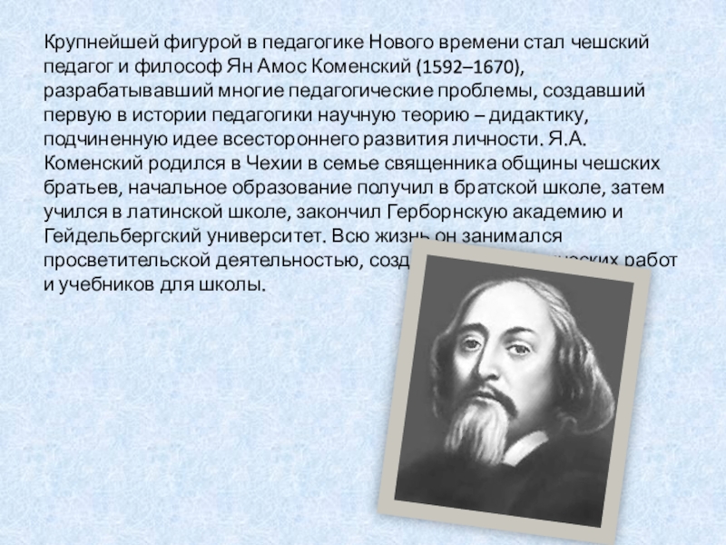 Ян Амос Коменский (1592–1670), разрабатывавший многие педагогические проблемы, создавший первую в истории педагогики научную теорию – дидактику, подчиненную идее всестороннего развития личности. Я.А. Коменский родился в Чехии в семье священника общины чешских братьев, начальное образование получил в братской школе, затем учился в латинской школе, закончил Герборнскую академию и Гейдельбергский университет. Всю жизнь он занимался просветительской деятельностью, создал ряд педагогических работ и учебников для школы.