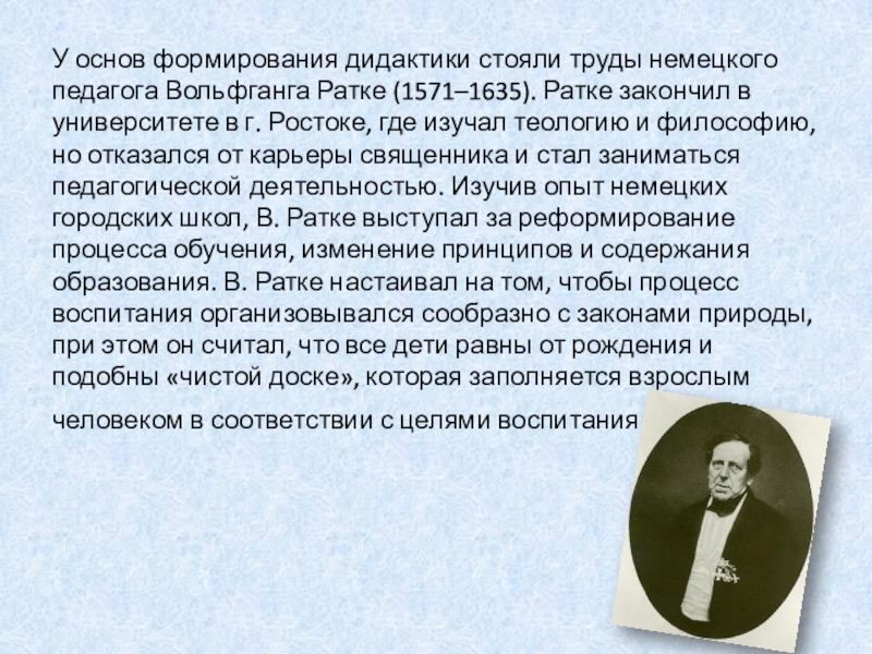 Слайд 7У основ формирования дидактики стояли труды немецкого педагога Вольфганга Ратке (1571–1635).