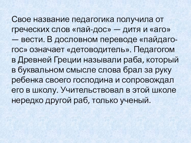 «аго» — вести. В дословном переводе «пайдаго-гос» означает «детоводитель». Педагогом в Древней Греции называли раба, который в буквальном смысле слова брал за руку ребенка своего господина и сопровождал его в школу. Учительствовал в этой школе нередко другой раб, только ученый.