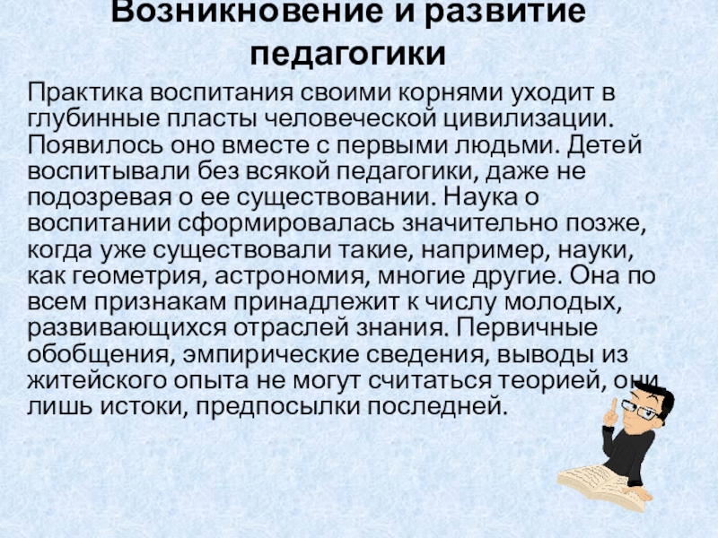 человеческой цивилизации. Появилось оно вместе с первыми людьми. Детей воспитывали без всякой педагогики, даже не подозревая о ее существовании. Наука о воспитании сформировалась значительно позже, когда уже существовали такие, например, науки, как геометрия, астрономия, многие другие. Она по всем признакам принадлежит к числу молодых, развивающихся отраслей знания. Первичные обобщения, эмпирические сведения, выводы из житейского опыта не могут считаться теорией, они лишь истоки, предпосылки последней.