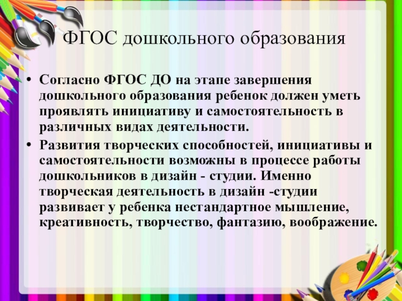 ФГОС дошкольного образованияСогласно ФГОС ДО на этапе завершения дошкольного образования ребенок должен уметь проявлять инициативу и самостоятельность в различных видах деятельности. Развития творческих способностей, инициативы и самостоятельности возможны в процессе работы дошкольников в дизайн - студии.