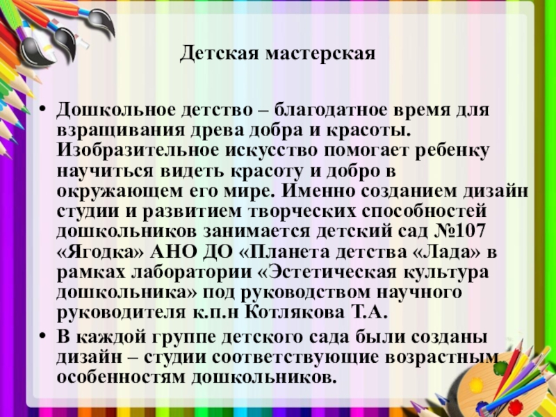 и красоты. Изобразительное искусство помогает ребенку научиться видеть красоту и добро в окружающем его мире. Именно созданием дизайн студии и развитием творческих способностей дошкольников занимается детский сад №107 «Ягодка» АНО ДО «Планета детства «Лада» в рамках лаборатории «Эстетическая культура дошкольника» под руководством научного руководителя к.п.н Котлякова Т.А.