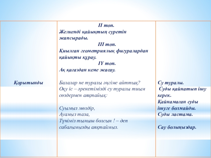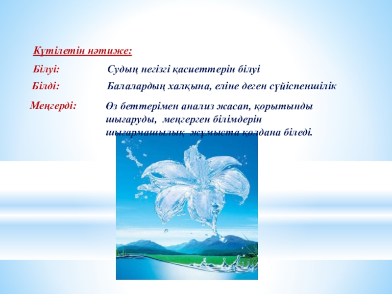 Балалардың табиғат жайлы білімдерін арттыру, табиғат сыйы туралы жан – жақты мәлімет беру, табиғатқа деген қамқорлық сезімін оятып, оның ғажайып сырларын ұғынуға үйрету, судың денсаулыққа пайдасы туралы жан- жақты түсінік беру, суды берекетсіз төгіп шашпай, сақтай білуге тәрбиелеу