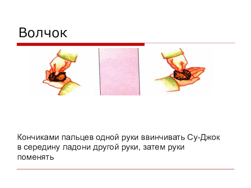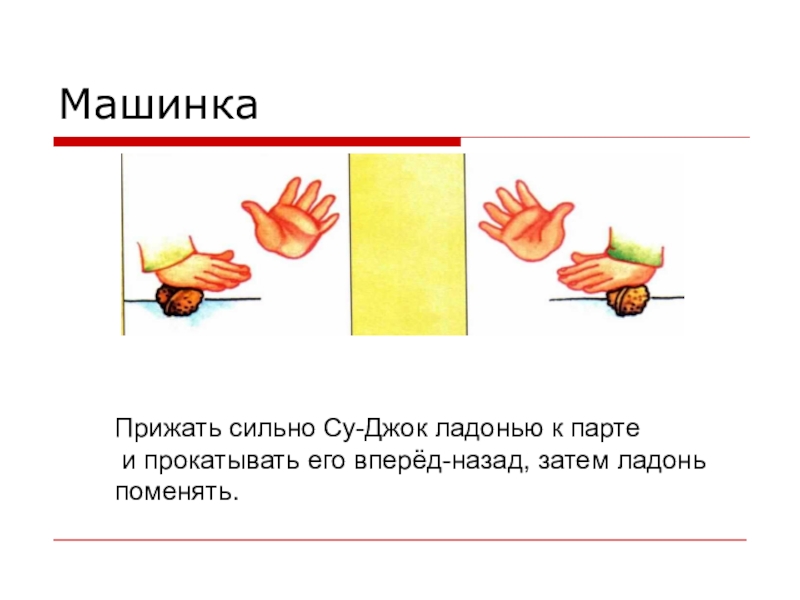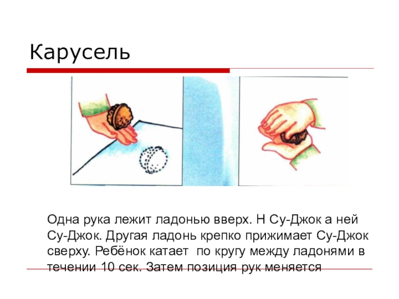 ладонь крепко прижимает Су-Джок сверху. Ребёнок катает по кругу между ладонями в течении 10 сек. Затем позиция рук меняется