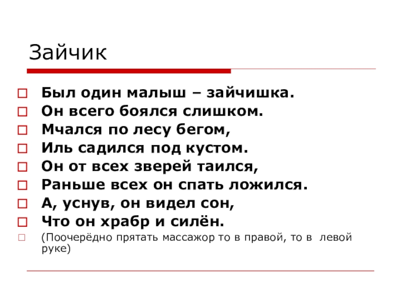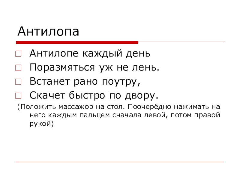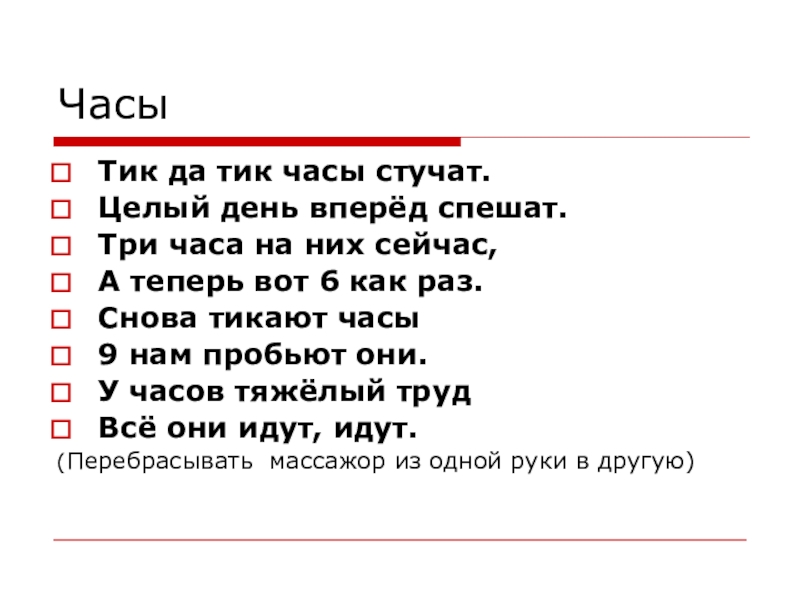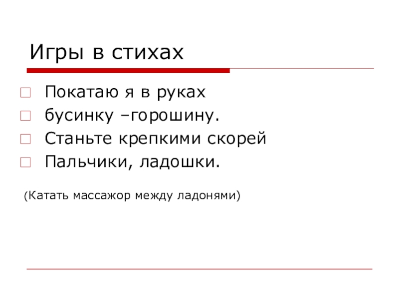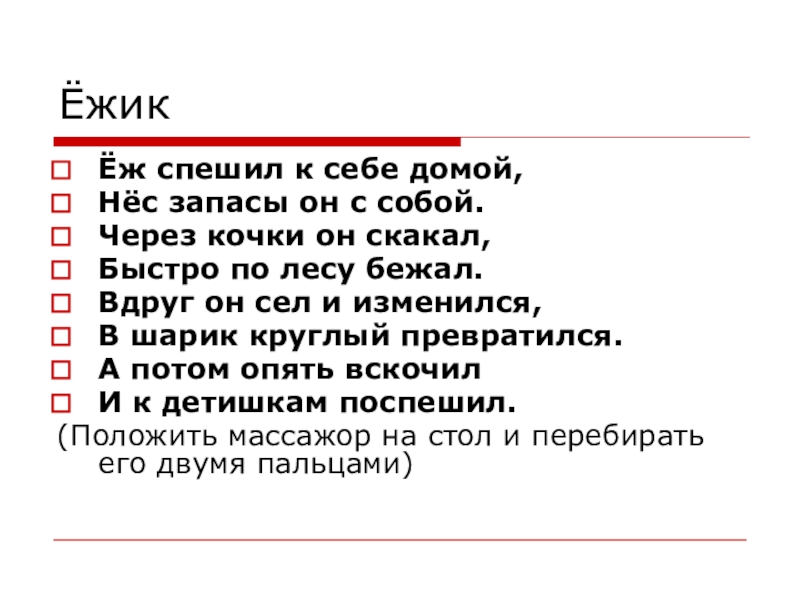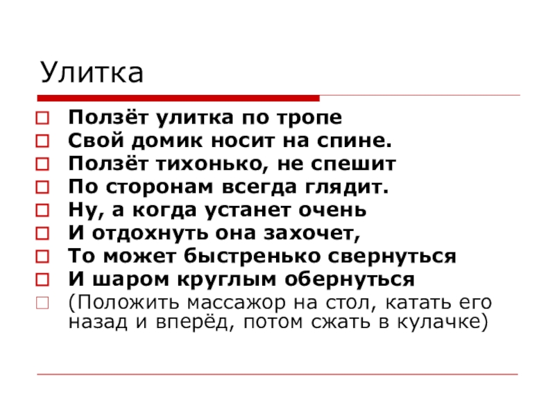 (Держать массажор в руке, потом покрутить им на руке, положить на стол и подтолкнуть пальцем от одной руки к другой)