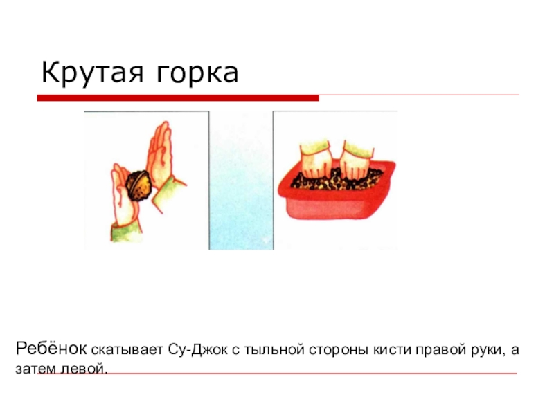 Ребёнок скатывает Су-Джок с тыльной стороны кисти правой руки, а