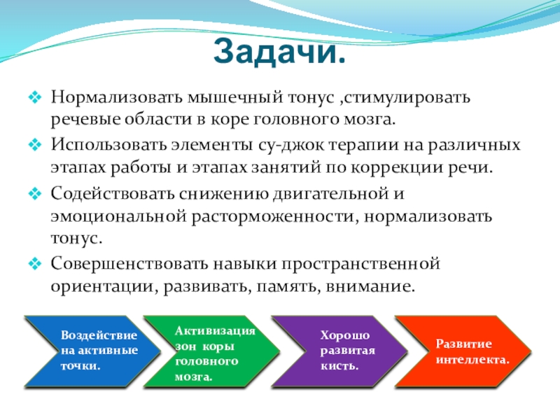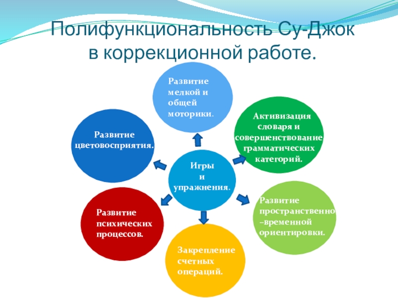 Цель использования су-джок терапии: стимуляция высокоактивных точек соответствия всем органам и системам, расположенных на кистях рук и стопах. Особенно важно воздействие на большой палец, отвечающий за голову человека. Кончики пальцев ,ногтевые пластины отвечают за головной мозг.