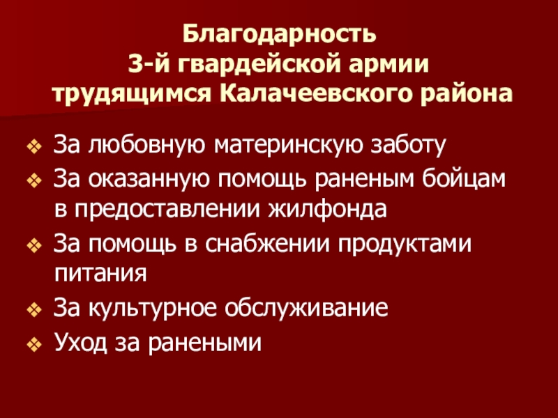 Благодарность  3-й гвардейской армии  трудящимся Калачеевского районаЗа любовную материнскую заботуЗа оказанную помощь раненым бойцам в