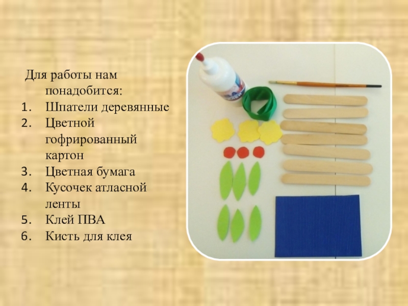 Для работы нам понадобится:Шпатели деревянныеЦветной гофрированный картонЦветная бумагаКусочек атласной лентыКлей ПВАКисть для клея