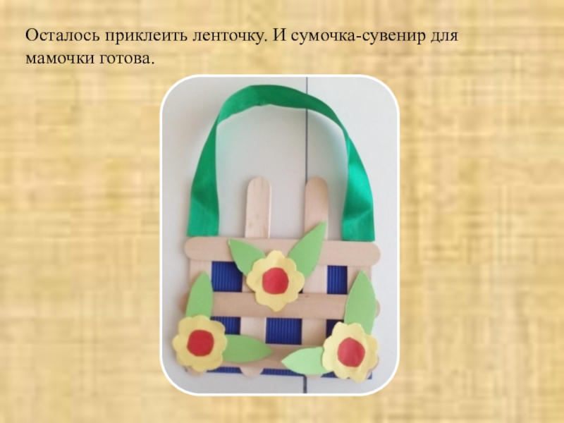 Слайд 7Осталось приклеить ленточку. И сумочка-сувенир для мамочки готова.