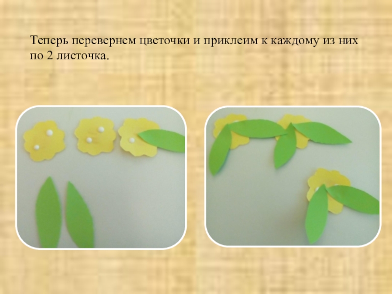 Теперь перевернем цветочки и приклеим к каждому из них по 2 листочка.