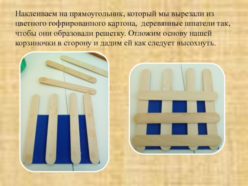 Наклеиваем на прямоугольник, который мы вырезали из цветного гофрированного картона, деревянные шпатели так, чтобы они образовали решетку.