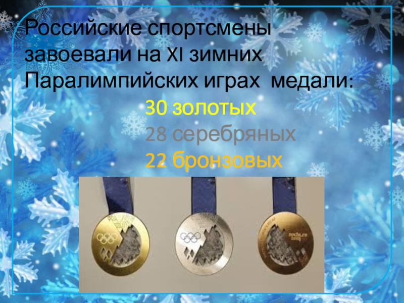 Слайд 14Российские спортсмены завоевали на XI зимних Паралимпийских играх медали: