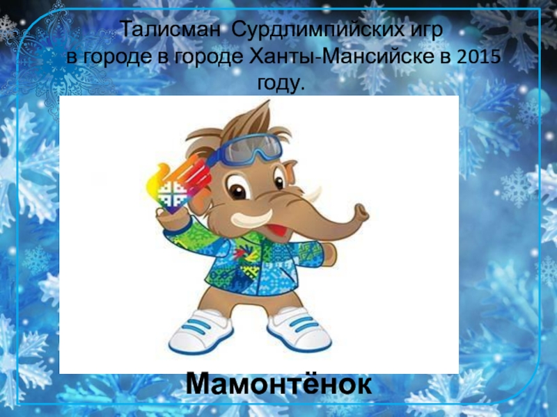Талисман Сурдлимпийских игр  в городе в городе Ханты-Мансийске в 2015 году.  Мамонтёнок