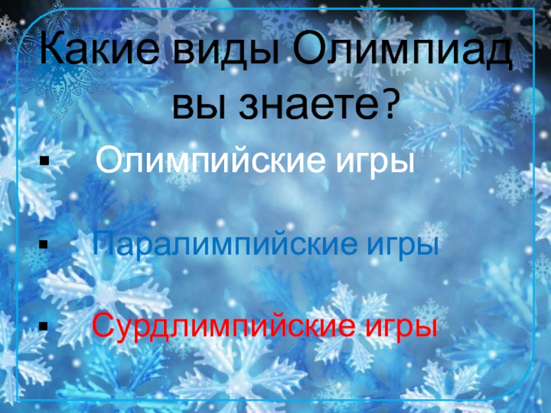 Какие виды Олимпиад вы знаете?   Олимпийские игры   Паралимпийские игры   Сурдлимпийские игры