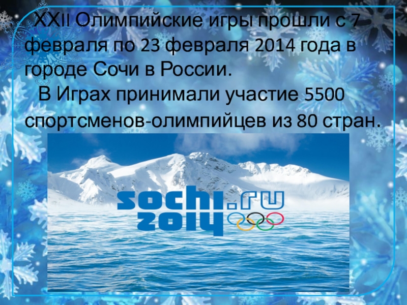 ХХII Олимпийские игры прошли с 7 февраля по 23 февраля 2014 года в городе Сочи в
