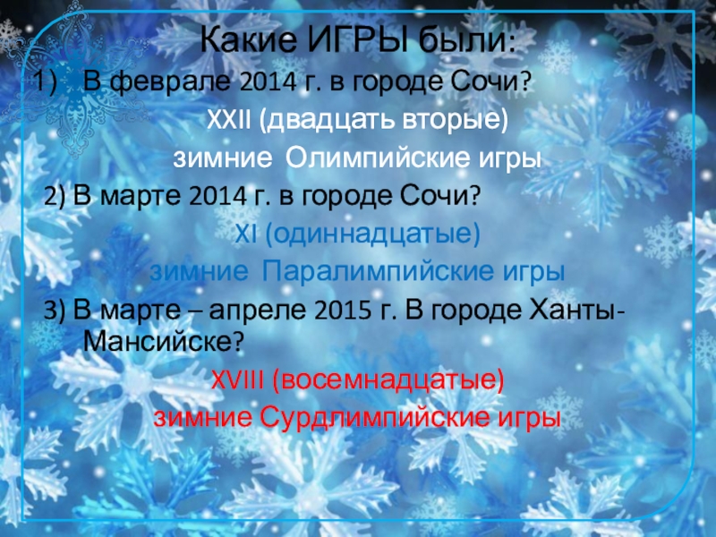 Какие ИГРЫ были:В феврале 2014 г. в городе Сочи?XXII (двадцать вторые) зимние Олимпийские игры 2) В марте