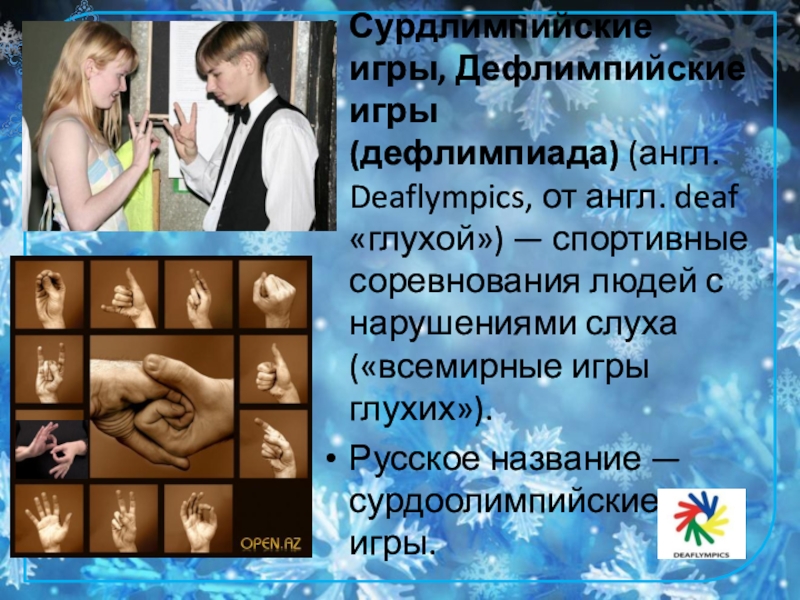 Слайд 17Сурдлимпийские игры, Дефлимпийские игры (дефлимпиада) (англ. Deaflympics, от англ. deaf «глухой») —