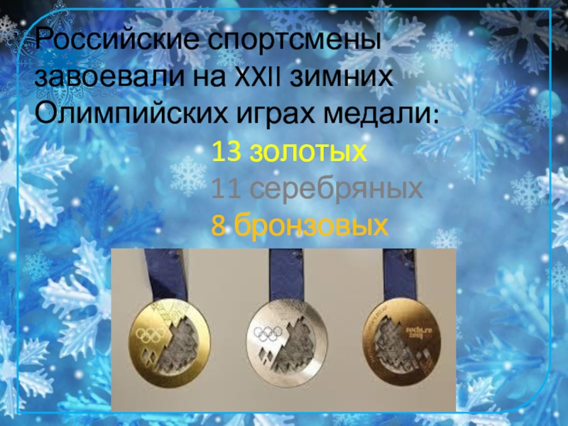 Слайд 8Российские спортсмены завоевали на XXII зимних Олимпийских играх медали: