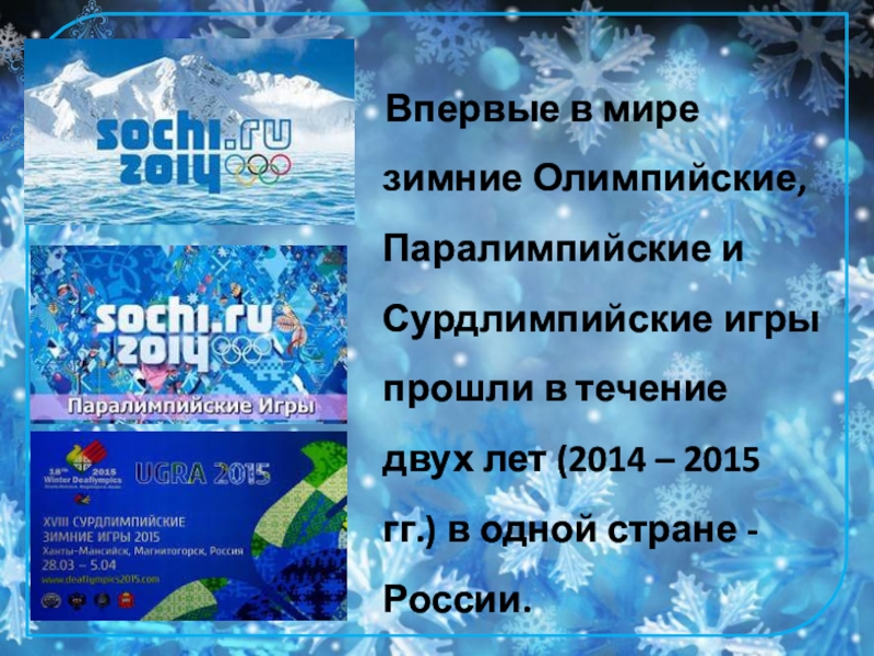 Сурдлимпийские игры прошли в течение двух лет (2014 – 2015 гг.) в одной стране - России.