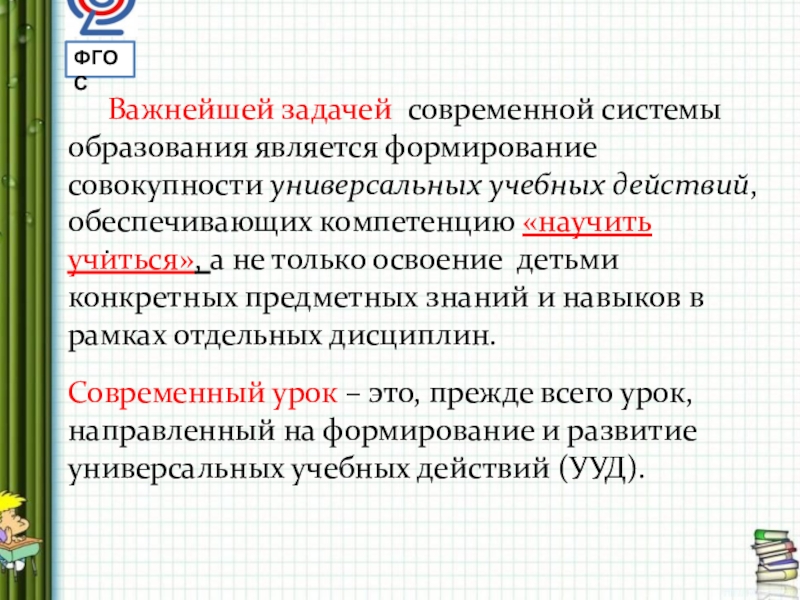 Важнейшей задачей современной системы образования является формирование совокупности универсальных учебных действий, обеспечивающих компетенцию «научить учиться», а не только освоение детьми конкретных предметных знаний и навыков в рамках отдельных дисциплин.