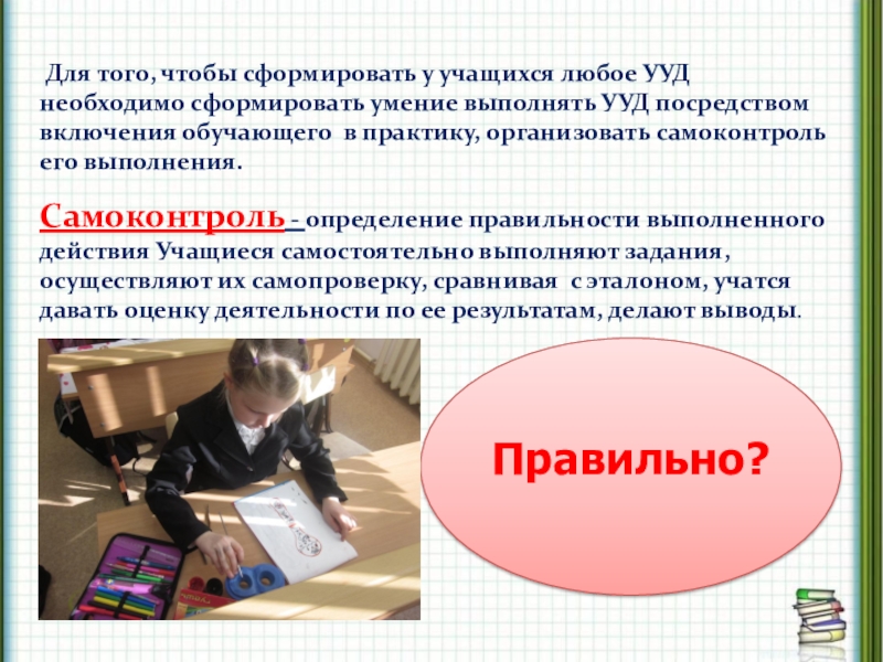Для того, чтобы сформировать у учащихся любое УУД необходимо сформировать умение выполнять УУД посредством включения обучающего в практику, организовать самоконтроль его выполнения.