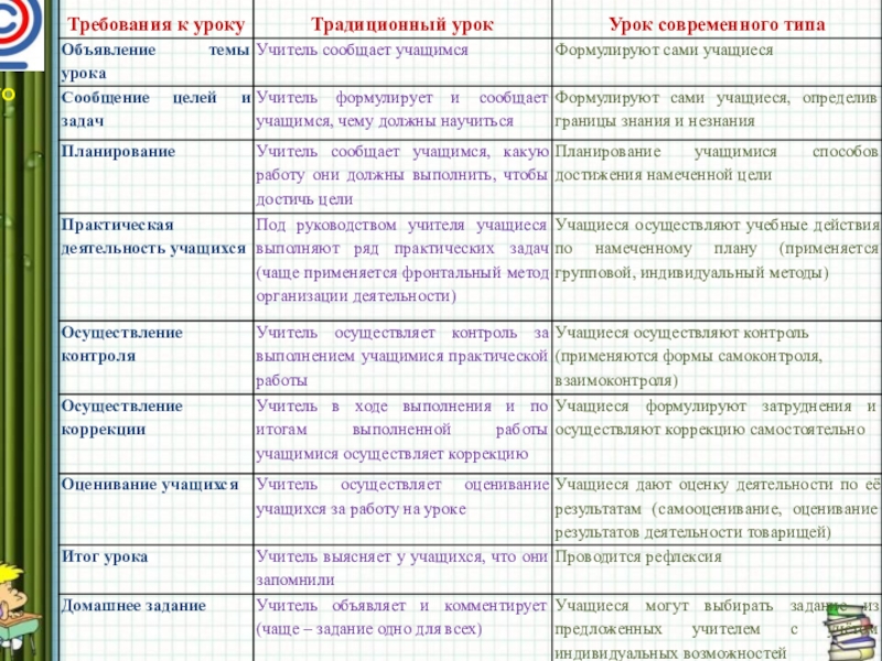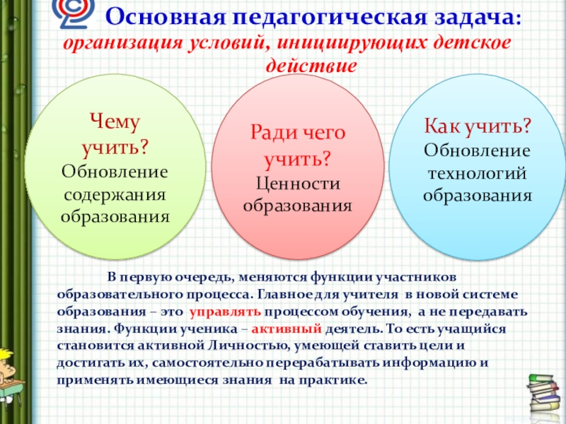 В первую очередь, меняются функции участников образовательного процесса. Главное для учителя в новой системе образования – это управлять процессом обучения, а не передавать знания. Функции ученика – активный деятель. То есть учащийся становится активной Личностью, умеющей ставить цели и достигать их, самостоятельно перерабатывать информацию и применять имеющиеся знания на практике.