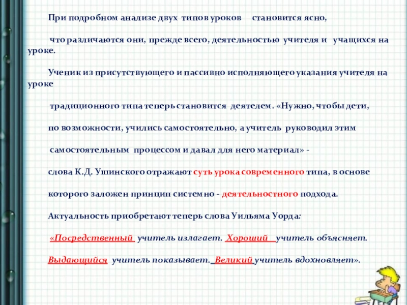 Фронтальный опрос, часто используемый на традиционном уроке, не давал возможности включить в деятельность всех учащихся, поэтому на современном уроке учитель включает учеников в индивидуальную и групповую виды деятельности.