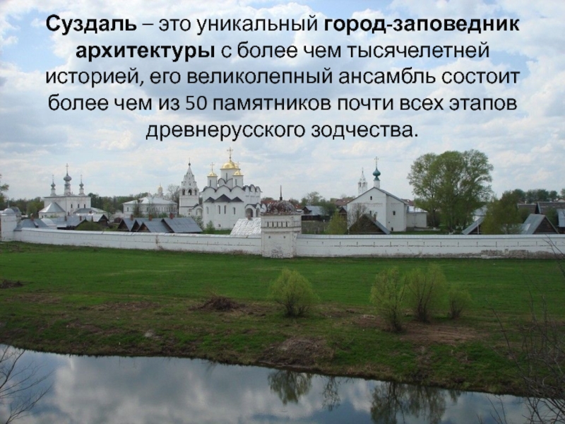 Слайд 3Суздаль – это уникальный город-заповедник архитектуры с более чем тысячелетней историей, его великолепный ансамбль