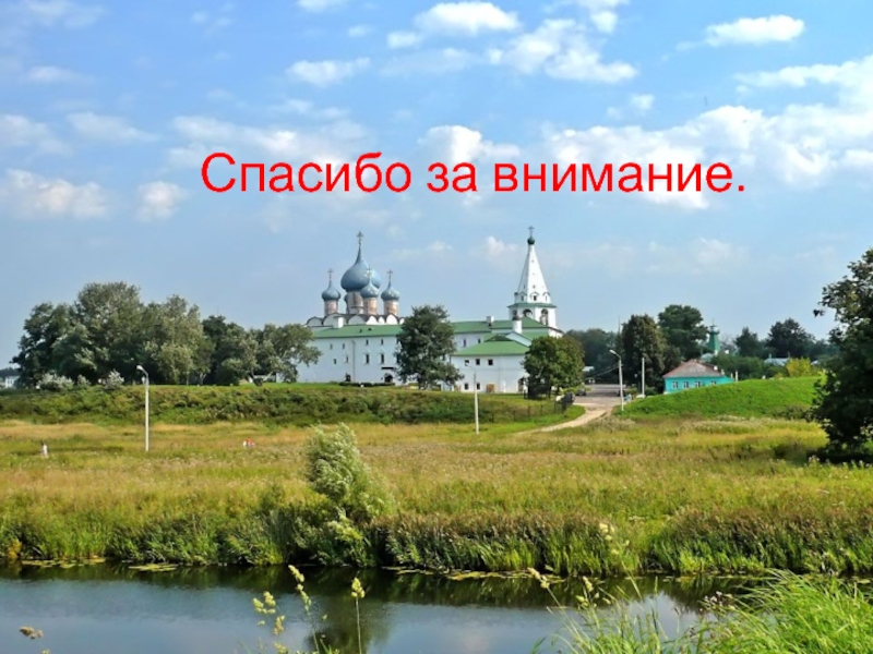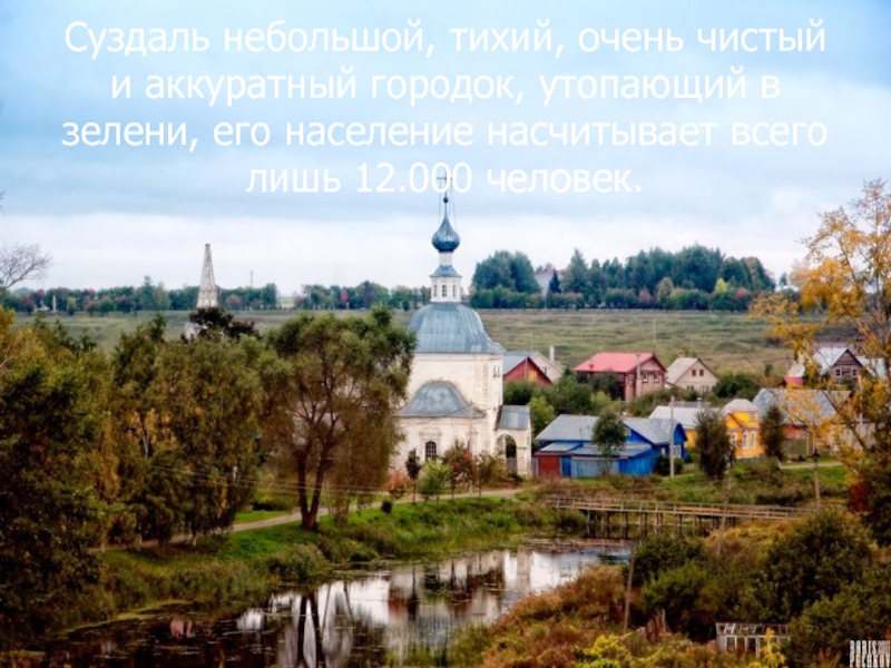 Слайд 10Суздаль небольшой, тихий, очень чистый и аккуратный городок, утопающий в зелени,