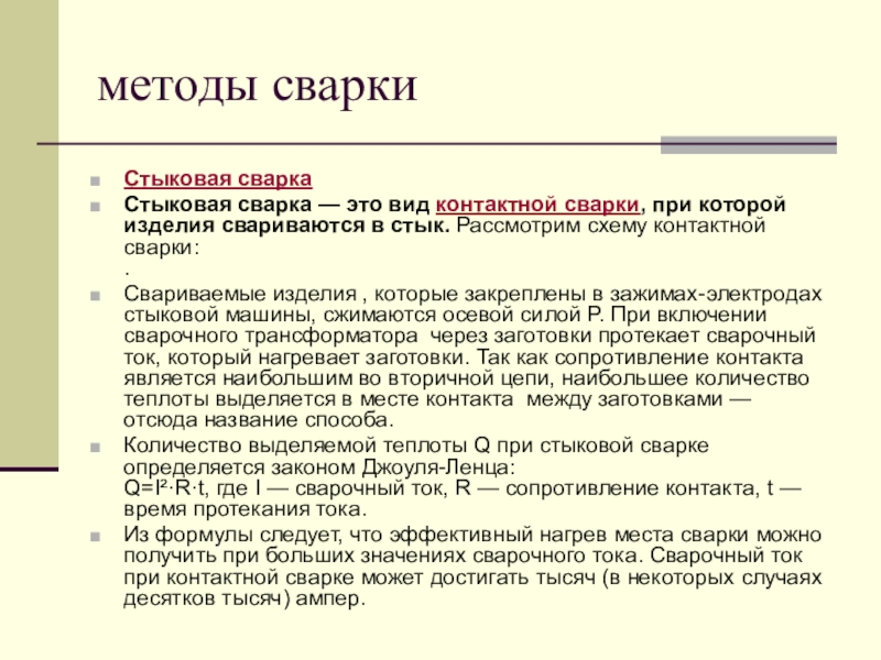 Количество выделяемой теплоты Q при стыковой сварке определяется законом Джоуля-Ленца:
