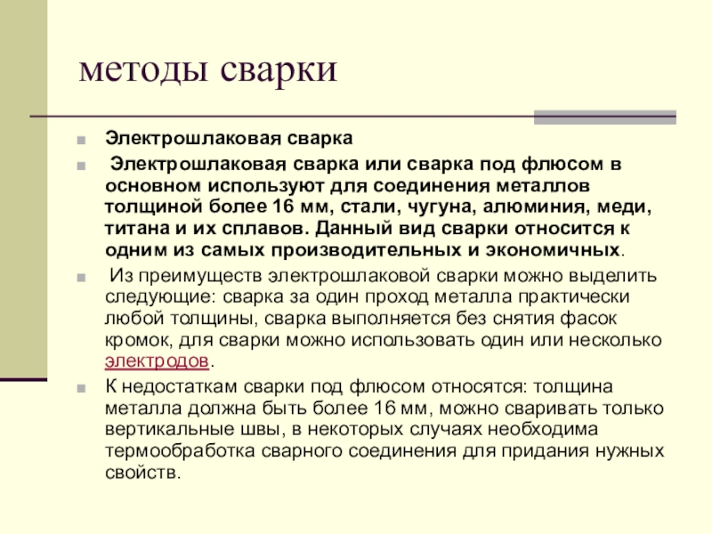 используют для соединения металлов толщиной более 16 мм, стали, чугуна, алюминия, меди, титана и их сплавов. Данный вид сварки относится к одним из самых производительных и экономичных.