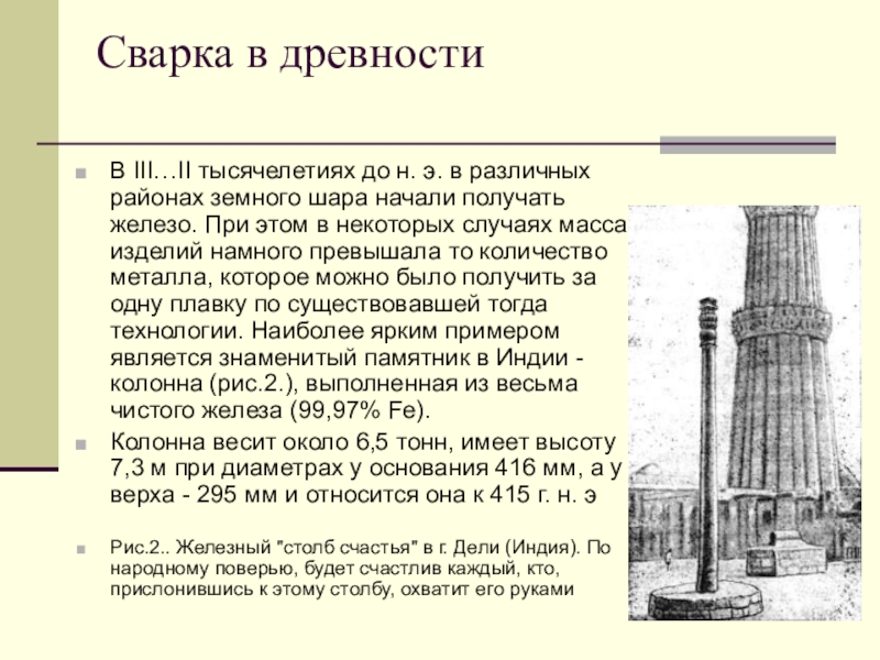 земного шара начали получать железо. При этом в некоторых случаях масса изделий намного превышала то количество металла, которое можно было получить за одну плавку по существовавшей тогда технологии. Наиболее ярким примером является знаменитый памятник в Индии - колонна (рис.2.), выполненная из весьма чистого железа (99,97% Fe).