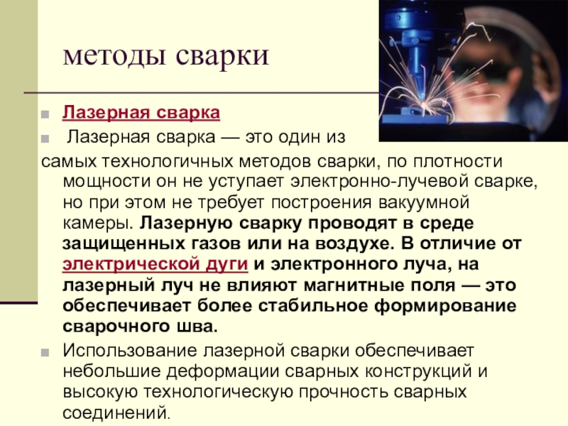 методов сварки, по плотности мощности он не уступает электронно-лучевой сварке, но при этом не требует построения вакуумной камеры. Лазерную сварку проводят в среде защищенных газов или на воздухе. В отличие от электрической дуги и электронного луча, на лазерный луч не влияют магнитные поля — это обеспечивает более стабильное формирование сварочного шва.