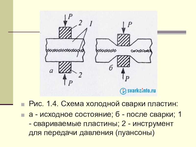- после сварки; 1 - свариваемые пластины; 2 - инструмент для передачи давления (пуансоны)