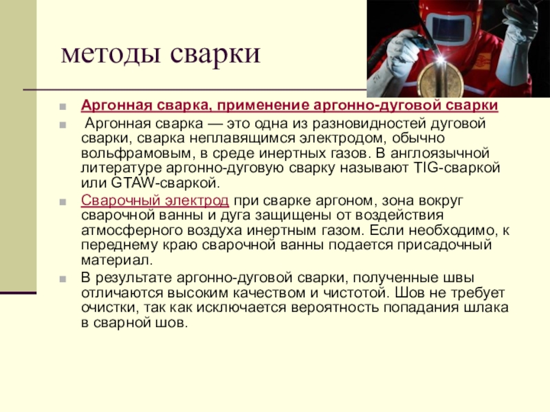 В результате аргонно-дуговой сварки, полученные швы отличаются высоким качеством и чистотой. Шов не требует очистки, так как исключается вероятность попадания шлака в сварной шов.