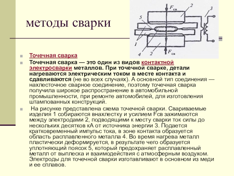 На рисунке представлена схема точечной сварки. Свариваемые изделия 1 собираются внахлестку и усилием Fсв зажимаются между электродами 2, подводящими к месту сварки ток силы до нескольких десятков кА от источника энергии 3. Подается кратковременный импульс тока, в зоне контакта образуется область расплавленного металла 4. Во время нагрева металл пластически деформируется, в результате чего образуется уплотняющий поясок 5, который предохраняет расплавленный металл от выплеска и взаимодействия с атмосферным воздухом. Электроды для точечной сварки изготавливают в основном из меди и ее сплавов.