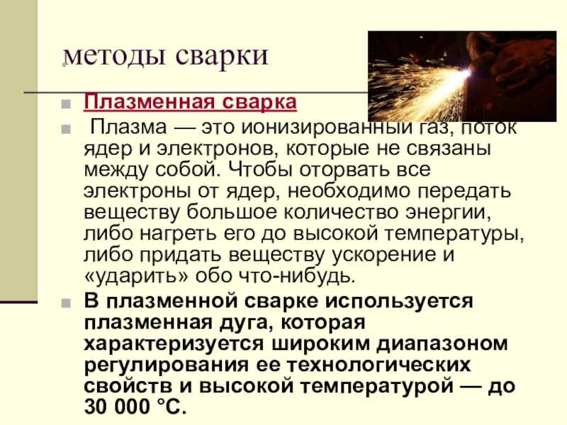 В плазменной сварке используется плазменная дуга, которая характеризуется широким диапазоном регулирования ее технологических свойств и высокой температурой — до 30 000 °С.