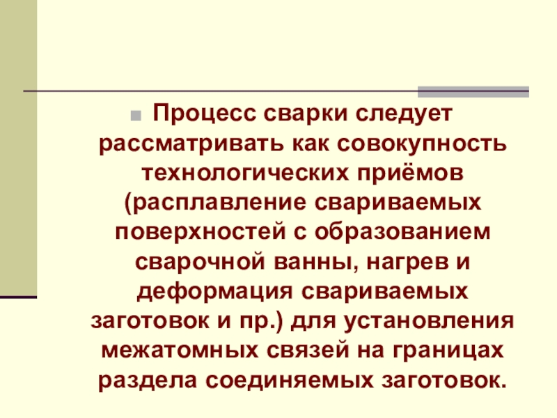Процесс сварки следует рассматривать как совокупность технологических приёмов (расплавление свариваемых поверхностей