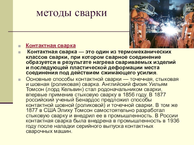 Основные способы контактной сварки — точечная, стыковая и шовная (роликовая) сварка. Английский физик Уильям Томсон (лорд Кельвин) стал родоначальником сварки, впервые применив стыковую сварку в 1856 году. В 1877 российский ученый Бенардос предложил способы контактной шовной (роликовой) и точечной сварки. В том же 1877 в США Элиху Томсон самостоятельно разработал стыковую сварку и внедрил ее в промышленность. В России контактная сварка была внедрена в промышленность в 1936 году после наладки серийного выпуска контактных сварочных машин.