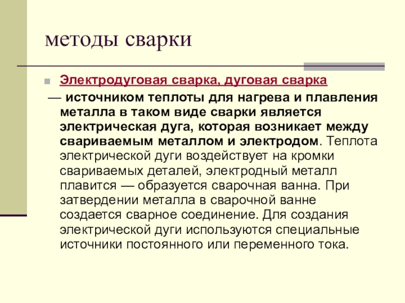 плавления металла в таком виде сварки является электрическая дуга, которая возникает между свариваемым металлом и электродом. Теплота электрической дуги воздействует на кромки свариваемых деталей, электродный металл плавится — образуется сварочная ванна. При затвердении металла в сварочной ванне создается сварное соединение. Для создания электрической дуги используются специальные источники постоянного или переменного тока.