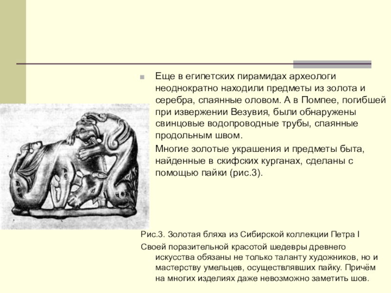 Многие золотые украшения и предметы быта, найденные в скифских курганах, сделаны с помощью пайки (рис.3).