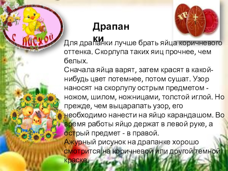 Слайд 21Для драпанки лучше брать яйца коричневого оттенка. Скорлупа таких яиц прочнее,