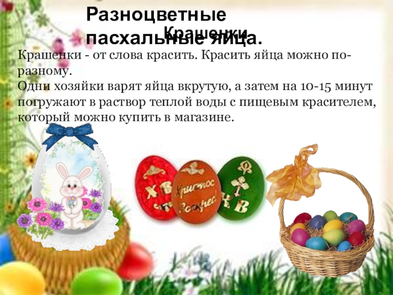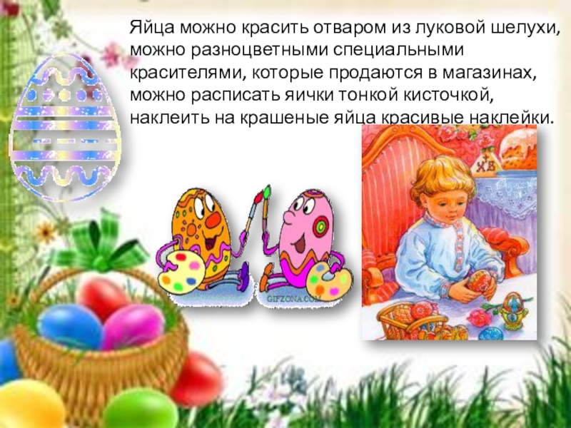 Слайд 13Яйца можно красить отваром из луковой шелухи, можно разноцветными специальными красителями,