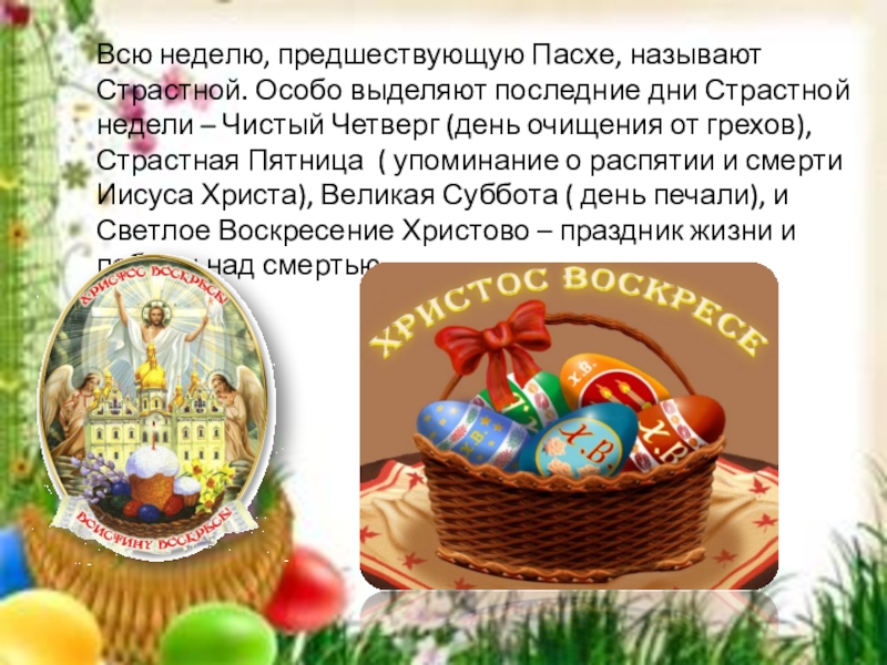 недели – Чистый Четверг (день очищения от грехов), Страстная Пятница ( упоминание о распятии и смерти Иисуса Христа), Великая Суббота ( день печали), и Светлое Воскресение Христово – праздник жизни и победы над смертью.