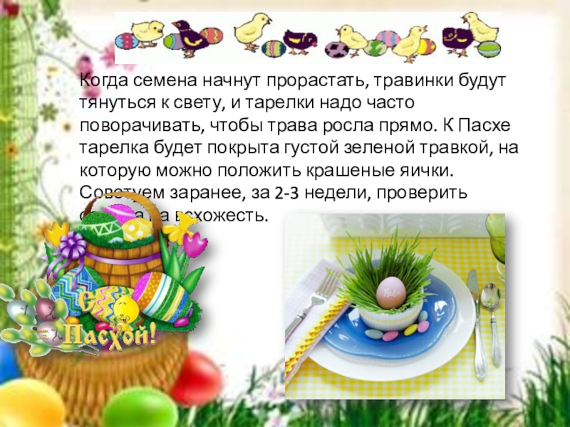 надо часто поворачивать, чтобы трава росла прямо. К Пасхе тарелка будет покрыта густой зеленой травкой, на которую можно положить крашеные яички. Советуем заранее, за 2-3 недели, проверить семена на всхожесть.