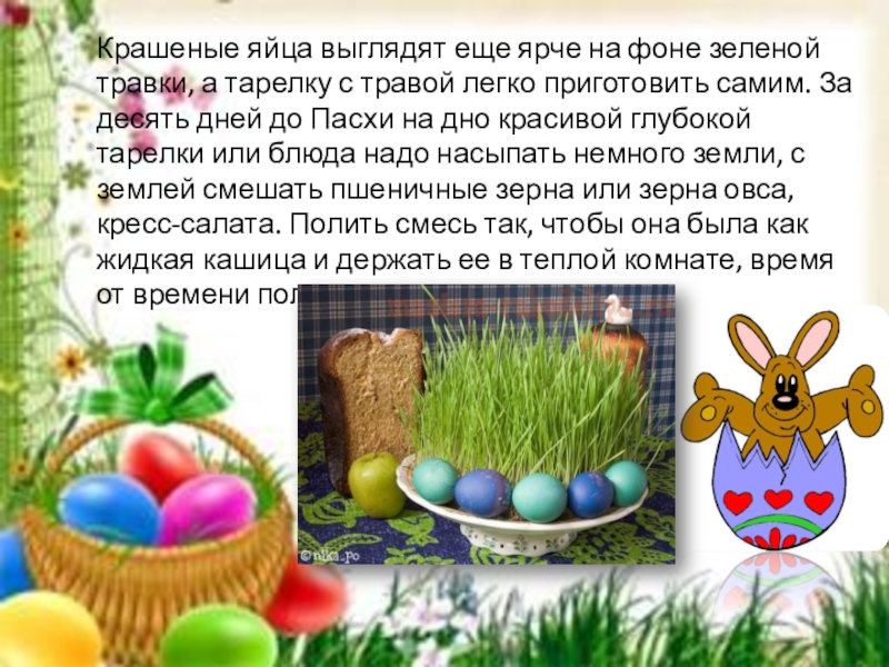 Слайд 14Крашеные яйца выглядят еще ярче на фоне зеленой травки, а тарелку