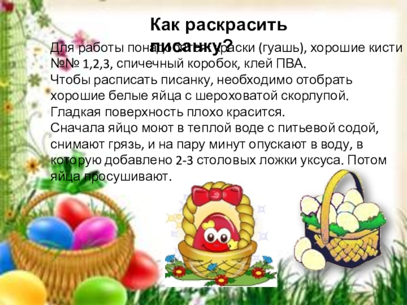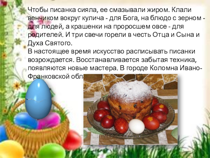 Слайд 26Чтобы писанка сияла, ее смазывали жиром. Клали венчиком вокруг кулича -