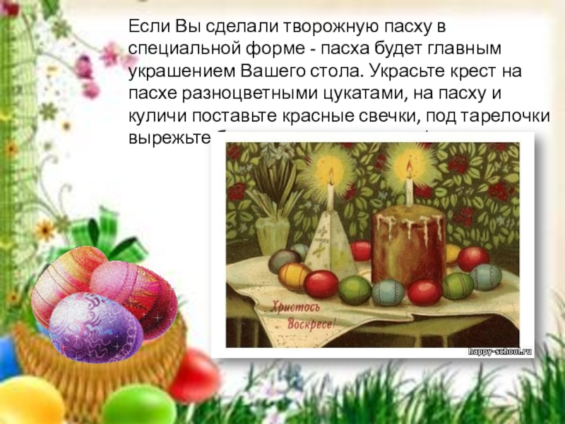 главным украшением Вашего стола. Украсьте крест на пасхе разноцветными цукатами, на пасху и куличи поставьте красные свечки, под тарелочки вырежьте бумажные цветные салфетки.
