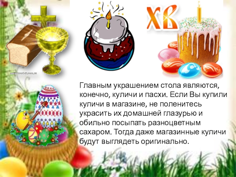 Слайд 16Главным украшением стола являются, конечно, куличи и пасхи. Если Вы купили